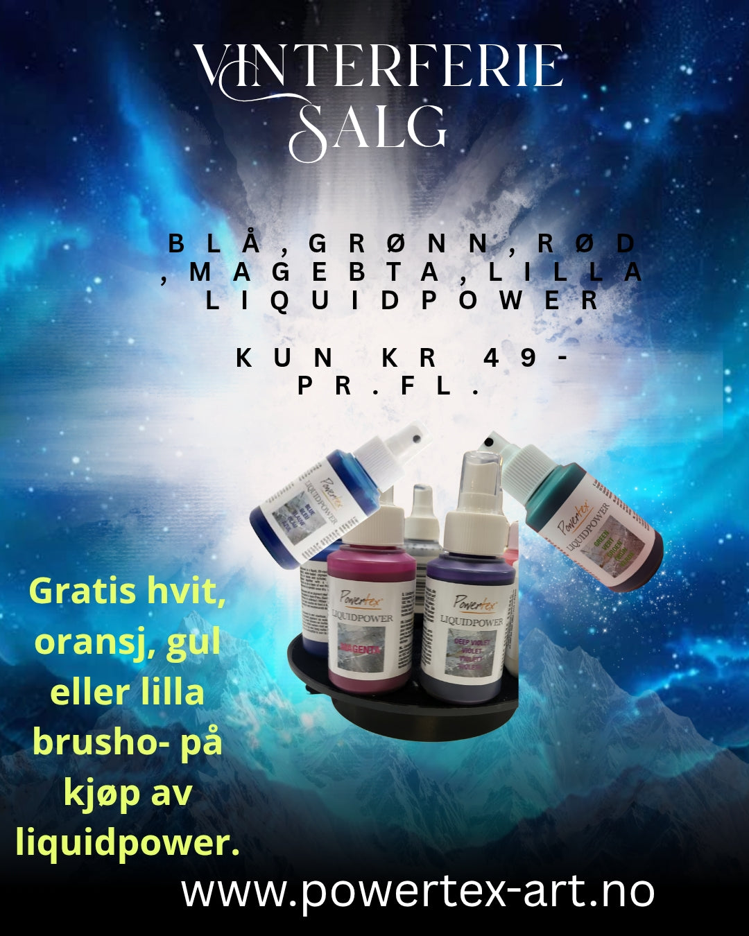 Reste salg av Liquidpower og Brusho – Powertex og Tri -Art produkter i NorgeSiste rest av liquidpower til kr 49.-pg gratis brusho på kjøpet.